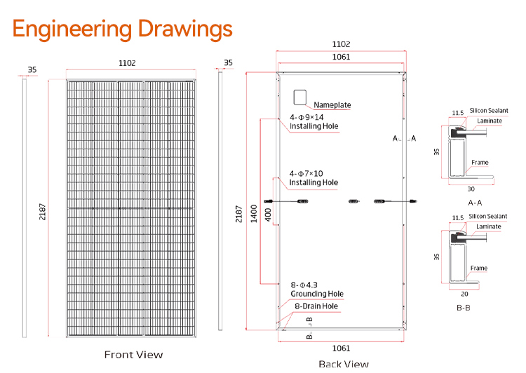 410w-430w(1762×1134×30mm);445w-465w(2094×1038×35mm);485w-505w(2187×1102×35mm);Weight: